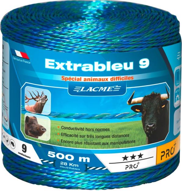 Extrableu 9 500 m, 9 Conducteurs dont 3 cuivre étamé Ø0,25 et 6 inox Ø0,2. Grâce à sa nouvelle torsion le fil EXTRABLEU 9 est encore plus résistant et s'adapte parfaitement aux clôtures longues et aux animaux difficiles.