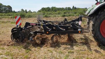 Largeur de 3 à 5 m. 3 rangées de dents avec socs, à sécurité non-stop ressort, hauteur 620 mm, dégagement sous châssis 750 mm. Écartement entre dents 310 mm, entre barres 750 mm. Rangée de disques niveleurs type fléau diam. 450 mm. Plusieurs profils de rouleaux au choix. Réglage de la profondeur mécanique.
