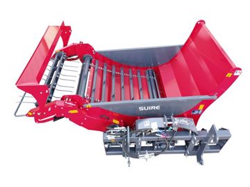 Attelage pique-bottes tracteur, chargeur ou telescopique. Verrouillage automatique entre la caisse et le pique-bottes. Deux démêleurs et une plateforme actionnée hydrauliquement pour défaire les bottes les plus difficiles. Chute du fourrage à la verticale